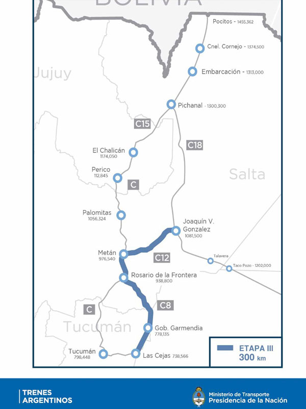 Trenes Argentinos Infraestructura, dependiente del Ministerio de Transporte de la Nación, tras recibir 16 ofertas y analizarlas en el contexto de todo el proyecto, designó los adjudicatarios de acuerdo a la mejor calificación técnica y mejor oferta económica para 4 de los 5 tramos licitados. Son un total de 217 km en la provincia de Salta, 16 km en Santiago del Estero y 67 km en Tucumán.
