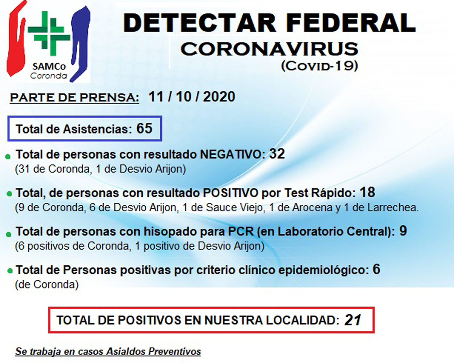 Los positivos de coronavirus fueron 21 y se obtuvieron 9 por tests rápidos, 6 por hisopados para PCR en el laboratorio central, y 6 por criterio epidemiológico.