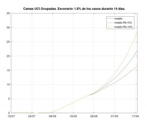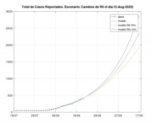 * De corroborarse este número R=1.55 y de persistir en el tiempo, el modelo proyecta llegar hasta más de 400 casos diarios a principos de noviembre, con más de 100 pacientes en terapia intensiva en dicho momento y acumulando un total de más de cientos de fallecimientos hasta principios del año que viene.