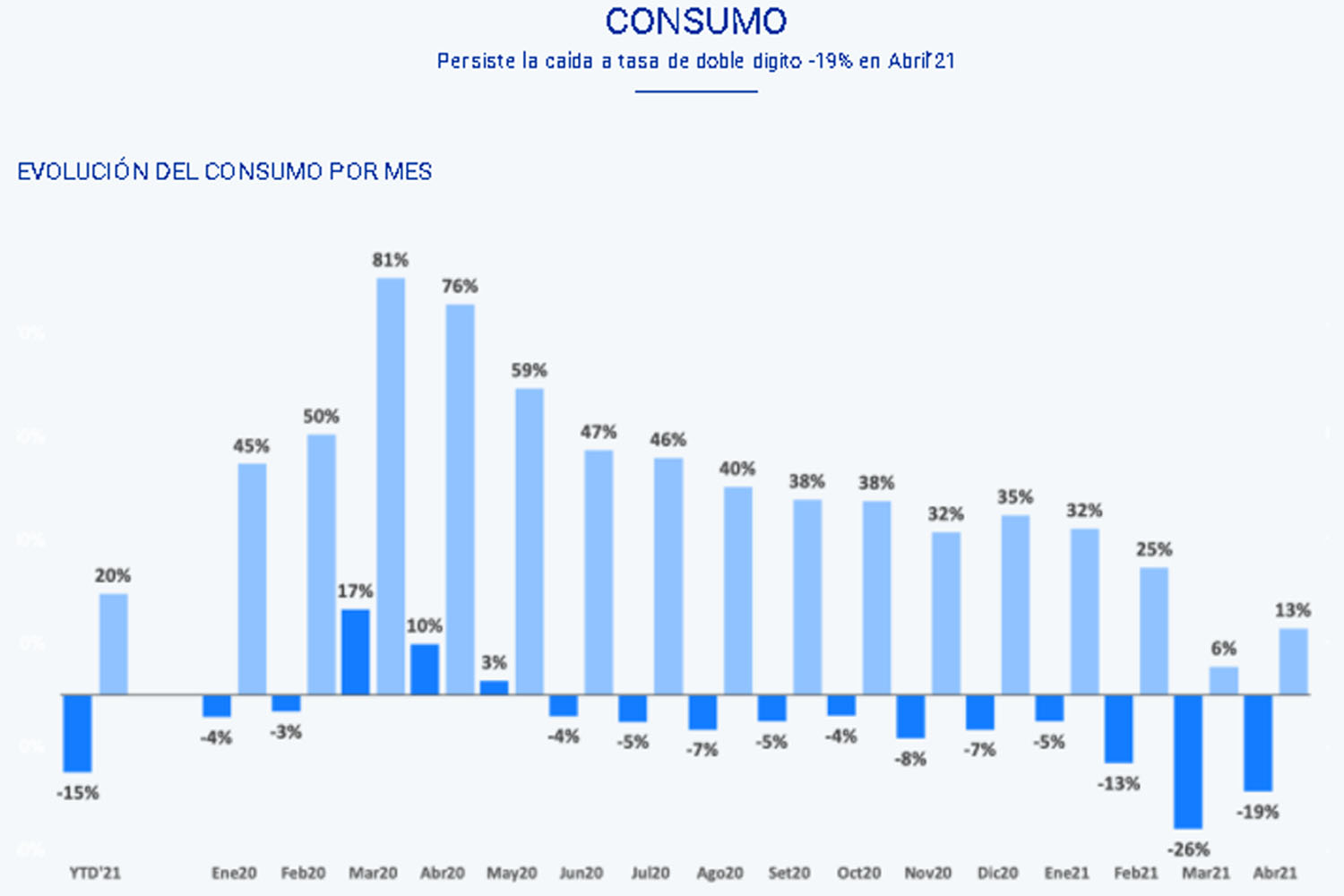 En Abril 2021, persiste la caída -19% en consumo a tasa de doble digito; el acumulado del 2021 (Enero-Abril) nos deja un saldo negativo de un -15% de acuerdo al estudio realizado por la consultora Focus Market. Las variaciones por área muestran similares tendencias, contracción en consumo en Metropolitana como en el Interior del país.