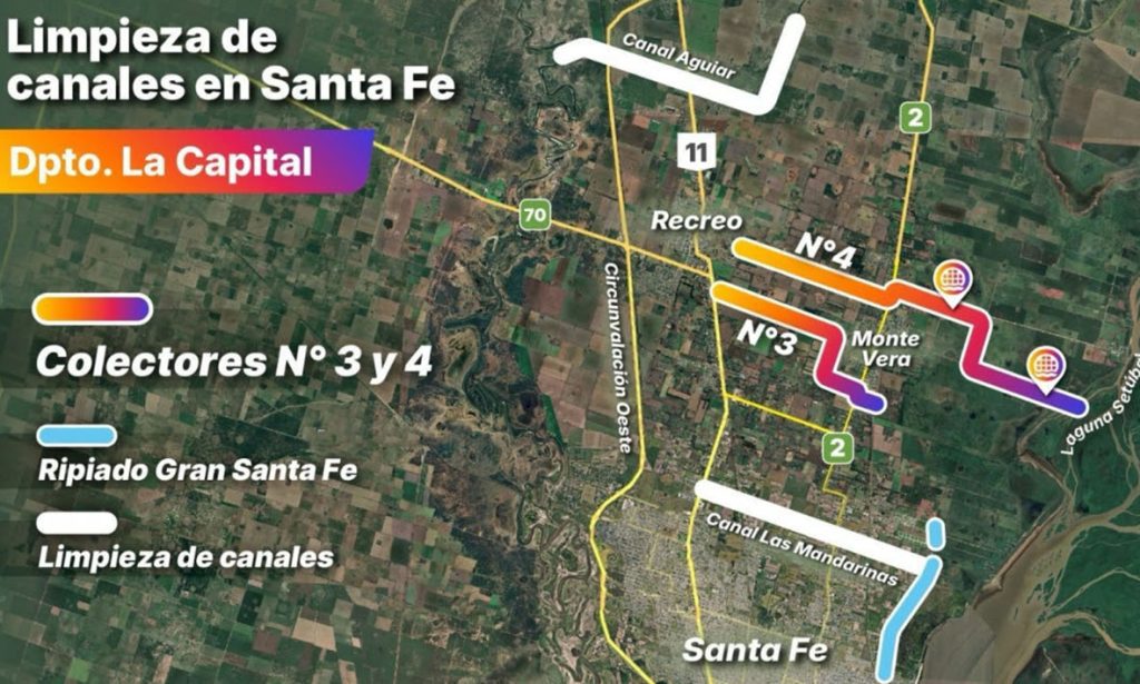 La intervención que desarrolla la Provincia en los canales Colectores 3 y 4 incluye tareas de desmalezamiento y remoción de sedimentos a lo largo de 16 kilómetros en total: 6 kilómetros en el Colector 3, entre Recreo y Monte Vera, desde la Ruta Nacional 11 hasta la Ruta 2; y 10 kilómetros en el Colector 4, al norte de Monte Vera, desde Recreo hasta su desembocadura en la Laguna Setúbal, en el que además se suman mejoras en dos alcantarillas.