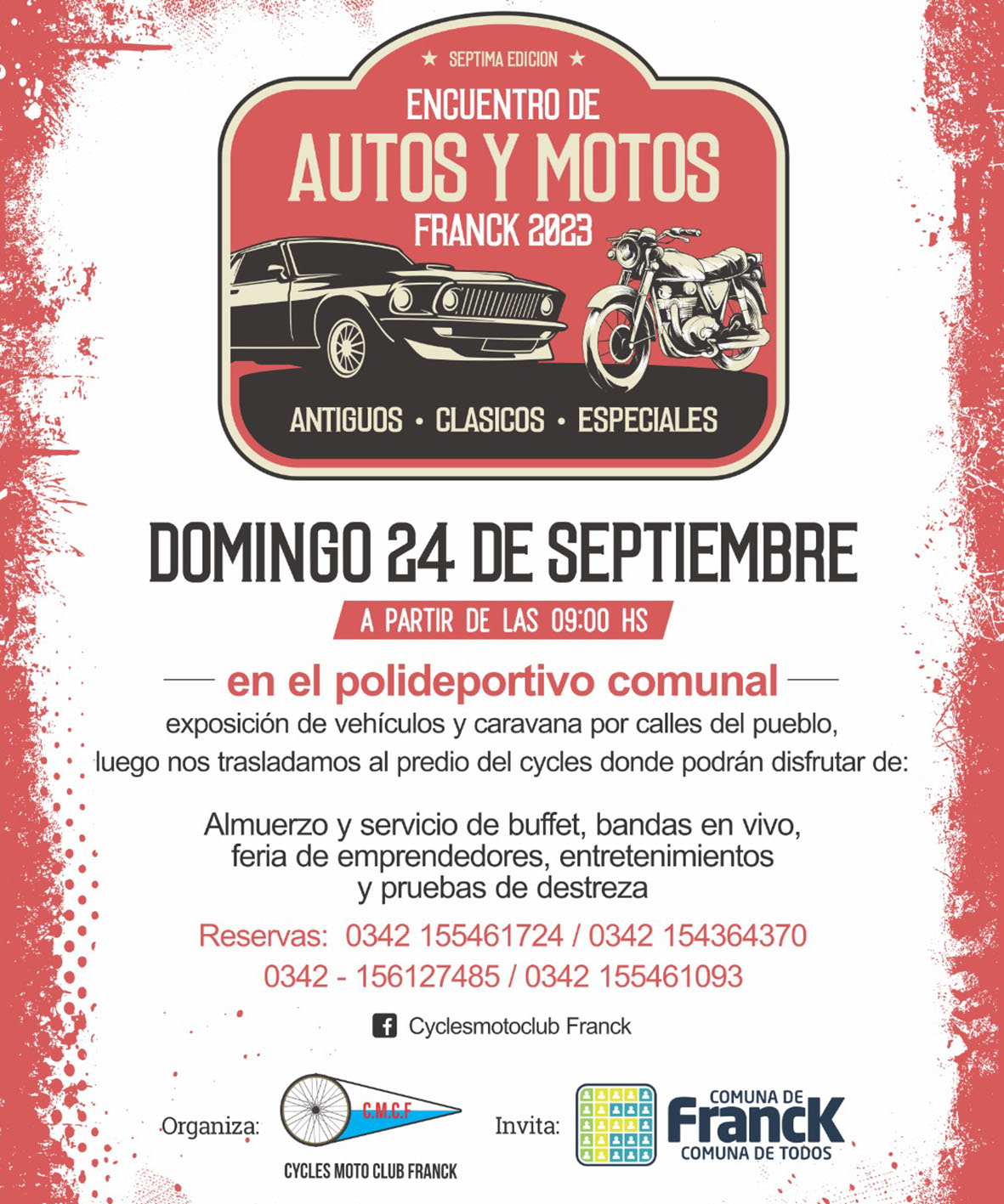 Organizado por el Cycles Moto Club y con el apoyo de la comuna de Franck, el próximo domingo 24 de septiembre, se llevará a cabo una nueva edición de este acontecimiento ya tradicional en la agenda de eventos institucionales de Franck y de toda la región.
