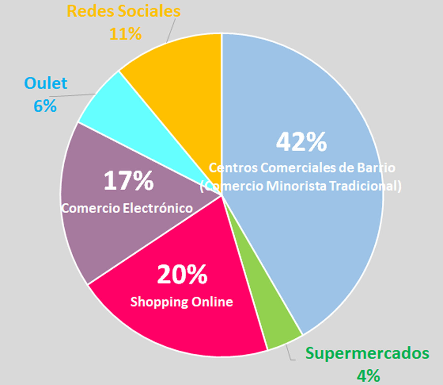 Según relevamiento realizado por Focus Market sobre una base de 7.560 casos en todo el país la distribución de la elección de la forma comercial minorista para realizar sus compras por parte de los argentinos para el Día de la Madre son los Centros Comerciales a Cielo Abierto 42%, Shopping Online 20%, Comercio Electrónico 17%, Redes Sociales 11%, Outlet 6%, Supermercados 4%.
