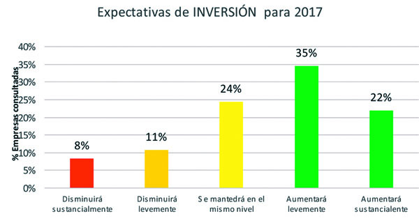 Por otro lado, un 24% de las empresas relevadas respondieron que mantendrán sin cambios su nivel de inversiones y un 19% de las empresas percibe expectativas desfavorables de inversión, es decir que prevén una disminución de las mismas en relación al año anterior. Yendo a planes concretos, el 97% de las empresas relevadas planea realizar inversiones durante 2017.