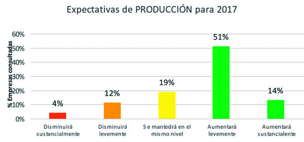 Respecto a las expectativas de producción, el 65% de las empresas consideró que el nivel de producción para 2017 presentará un incremento en relación al año 2016.