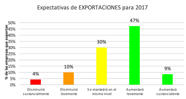 En el otro extremo, solo un 14% vaticina una disminución en sus exportaciones durante 2017, mientras que el 30% restante espera en 2017 similar nivel de exportaciones al del año 2016.