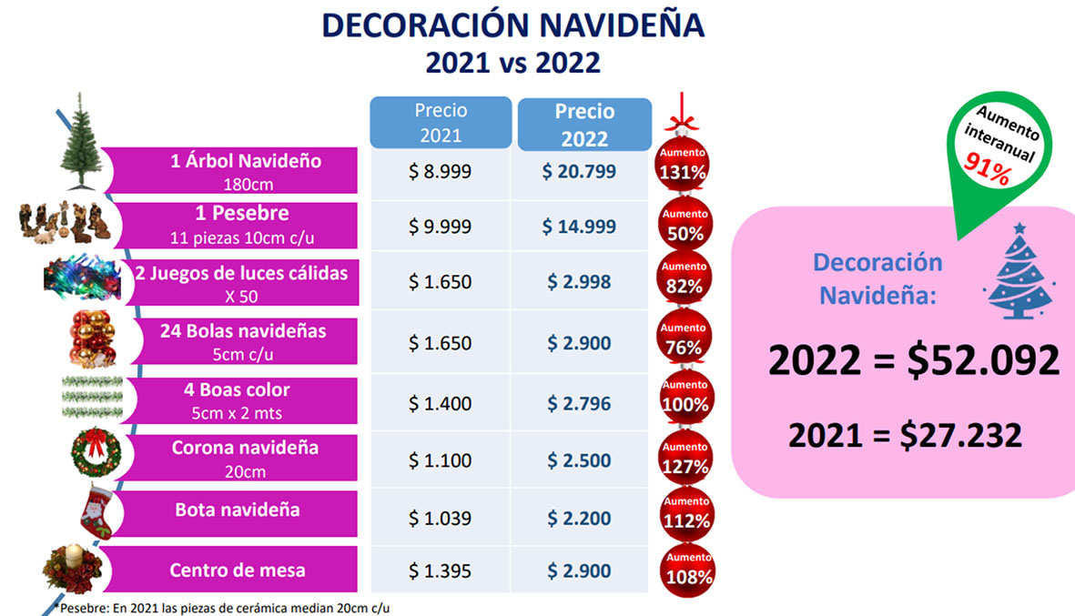 La decoración navideña habitual en los hogares de los argentinos tuvo un incremento de precios promedio interanual del 91%. En el Top 3 de productos decorativos con mayor aumento se encuentran: 1-Árbol Navideño 131%; 2- Corona Navideña 127%; 3-Bota Navideña 112%. En el Top 3 de menores aumentos se encuentran: 1-Pesebre 50%; 2-Bolas Navideñas 76%; 3-Juegos de Luces 82%.